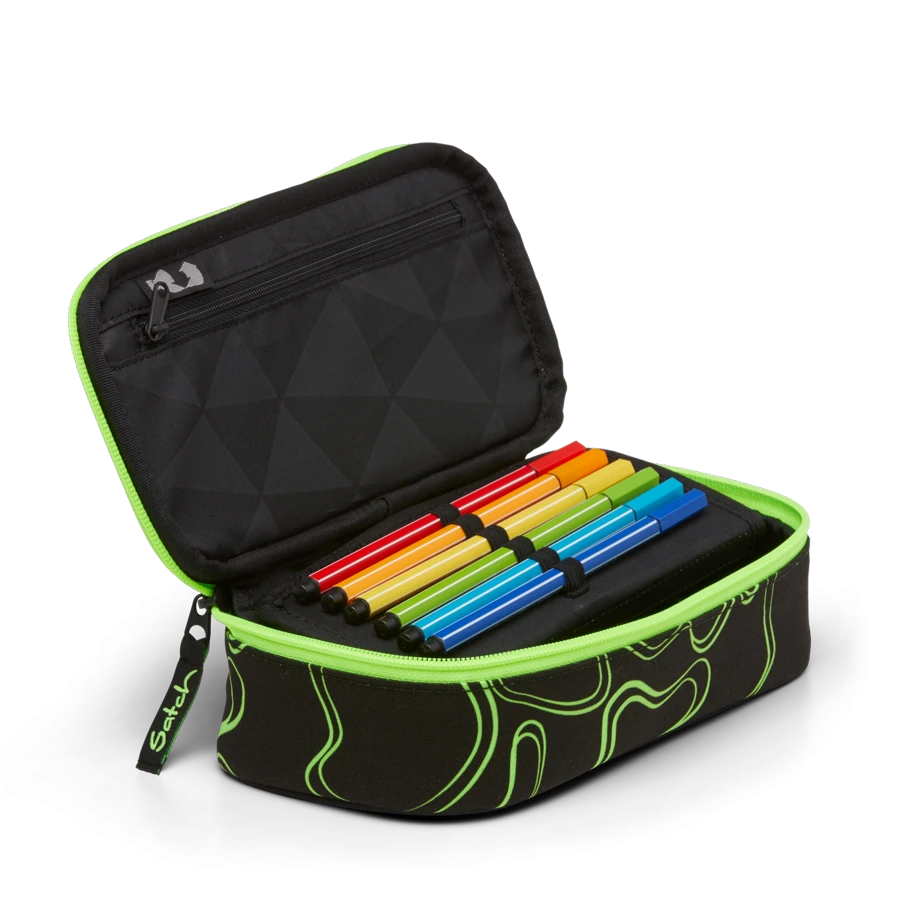 Extra viel Platz bietet die satch Schlamperboxen, gleichzeitig kannst Du ganz easy in Deinem Mäppchen Ordnung halten. Der Deckel der lässt sich schnell und einfach aufklappen. Innen findest Du ein Reißverschlussfach, in dem Du Deinen Schülerausweis oder auch Kleingeld für die Mensa oder Kantine verstauen kannst. Der aufklappbare Einsatz darunter bietet Deinem Geodreieck Schutz und enthält zudem ein Fach für den Stundenplan sowie Einschübe für die Füllerpatronen. Im geräumigen Fach darunter ist Platz für Deine Stifte.